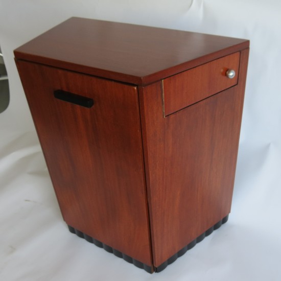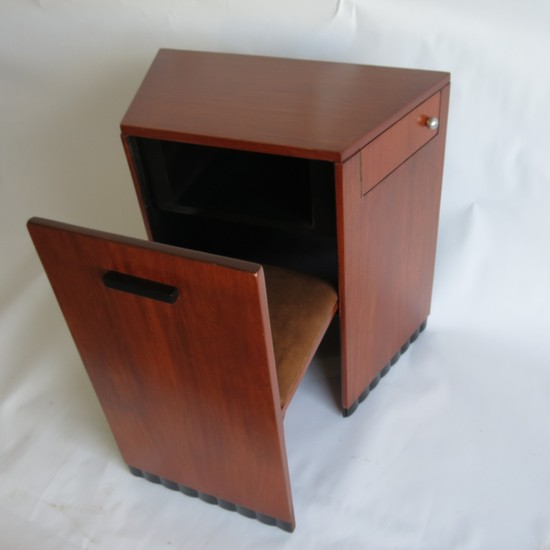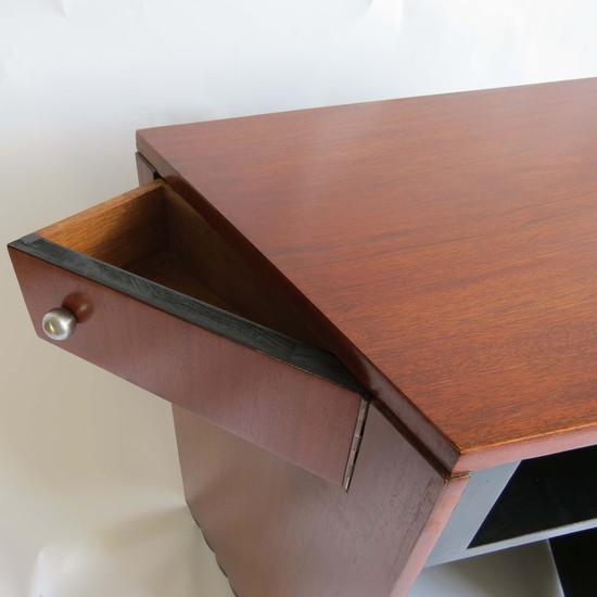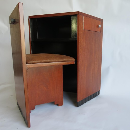 A fascinating small American Art Deco writing desk with conforming chair. Made and retailed by the Modernage Furniture Company, New York ca. 1933. The trapezoid shaped desk is constructed of walnut and walnut veneers. The front of the desk pulls out and becomes a chair. There is a shelf inside the desk for storage as well as swing out drawers on each side with chromed pulls. The seat has been recovered in soft leather. The desk is 28” wide on one end and 18” wide at the rear end. The chair is 14 ¾” deep and 30” high.