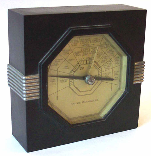 This barometer, “Stormoguide”, was designed by Walter Dorwin Teague (1883 – 1960) for the Taylor Instrument Companies of Rochester. The barometer was introduced in the February 1933 issue of The Studio Magazine. The mechanism has a 1926 patent number. Constructed of Bakelite with chrome fittings, the barometer measures 5” on each side and 1 ½” deep.