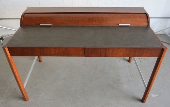 A unique vintage mid century modern roll top desk by the Hekman Furniture Company of Grand Rapids, Michigan. Hekman Furniture was funded in 1922 and become part of the Howard Miller Company in 1983. The company is still in business but this desk from 1960's is not in their line. The desk, with two drawers, has a body of figured walnut with stained oak hex-shaped legs. Inside the drawers the secondary wood is oak. The desk has a cylinder roll which opens to reveal storage compartments. The pulls on the cylinder and the leg stretchers are aluminum. The writing surface is of a tough composition made to resemble leather, it is 14 1/2” by 51 1/2”. Over all the desk is 54” wide, 28 ½” deep and 34” high at the back, the writing surface is 28 ¼” high. The desk is in excellent restored condition.