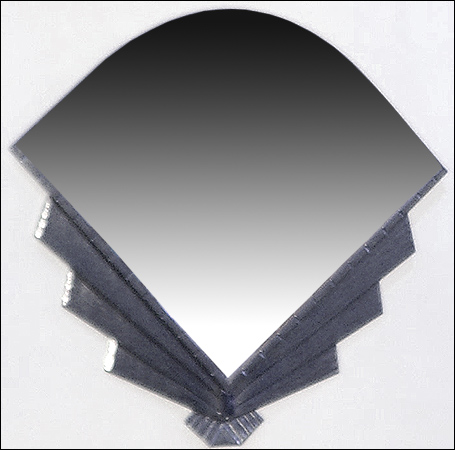 This French art deco mirror is in natural iron, polished to a pewter color and sprayed with clear lacquer to keep it from turning. A small rectangle of brass sits at the bottom or the mirror. It measures 24" wide and 23" high.