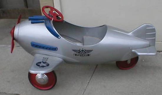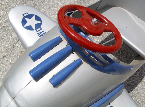 This American art deco streamline airplane pedal car dates to the early 1940’s when the advent of World War II caused a surge of patriotic feelings. Our Airforce was the “Army Air Force” and the wings are emblazoned “U.S. Army”. The fuselage is marked “Patrol” with fierce eagle and stars. The propeller, streering wheel and wheels are red, the three “guns”, cockpit faring and exhaust manifold are blue. The plane measures 44 ½” long, the wingspan is 36” and the top of the steering wheel is 25” from the ground. The plane is in excellent condition.