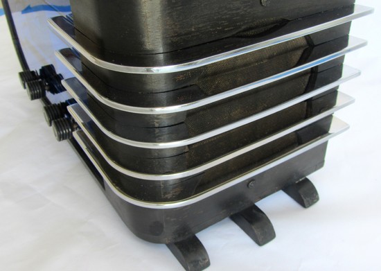 This American art deco radio was designed by Walter Dorwin Teague (1883 - 1960) for the Sparks – Worthington Company, Jackson, Michigan. Known as the 558, it was released in 1937. Collectors know it today as “the four knob sled” . The radio is constructed of etched blue mirror, ebonized wood, chrome fins and, of course the radio bits inside. The radio is 17 ½” wide 8 ½” deep and 8 ¾” high.