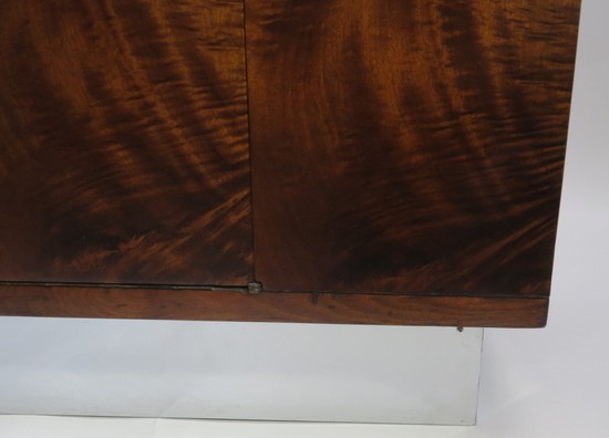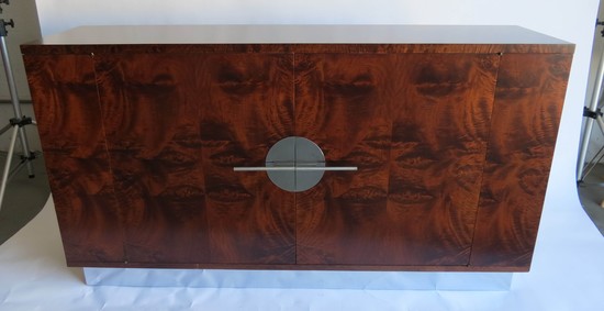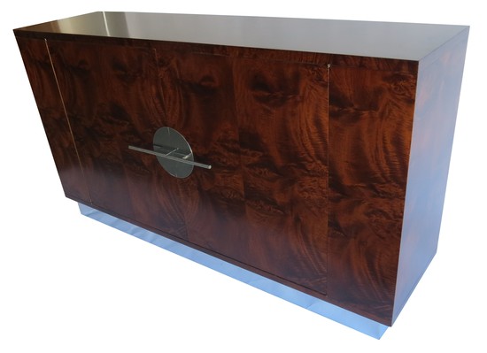 Walter Dorwin Teague (1883-1960) designed this sideboard circa 1935. It was manufactured by the Hastings Table Company of Grand Rapids, Michigan. The side board has book matched Paldao burl exterior and rests on an indented chrome steel base. The central handles match the base. The two doors open to reveal two shelves on the right and four drawers on the left, the top drawer has a sliding felt lined box to hold silverware. The left hand corner is hinged to rotate out and show four shelves for glassware and two areas for bottles. The sideboard is 68" wide, 18" deep, and 38" high.