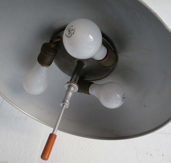 Walter Von Nessen (1889-1943) designed this rare American art deco floor lamp ca 1930 for Nessen Studio where he worked with a work force of one craftsman. The lamp has a round chrome base with an offset vertical chrome shaft, the shaft telescopes, raising the lamp from 50” high to 59” high (63” high with the shade swiveled up). The curved extension terminates in a fitting which enables the user to point the shade down for reading or up for ambient light. The enameled white dome shade has a switch on top to activate one, two or three of the bulbs. A rod with an orange Bakelite handle facilitates rotating the shade. The lamp is marked on the base “Nessen Studio, NY”.