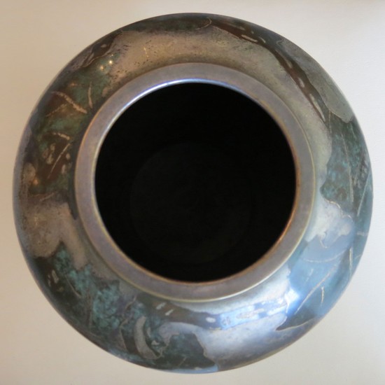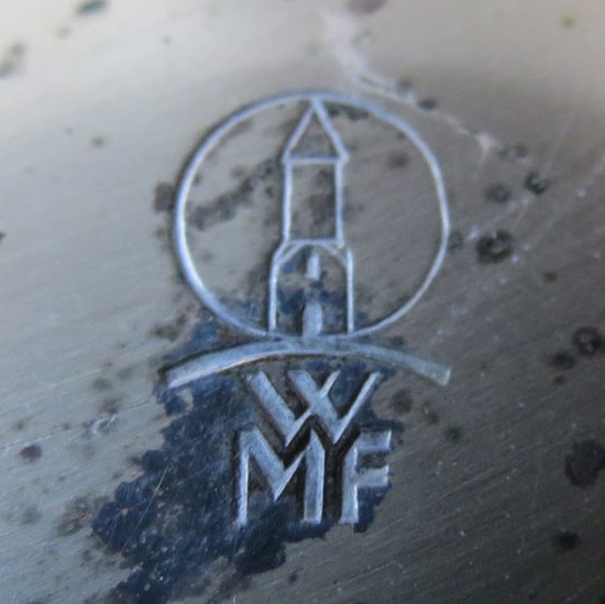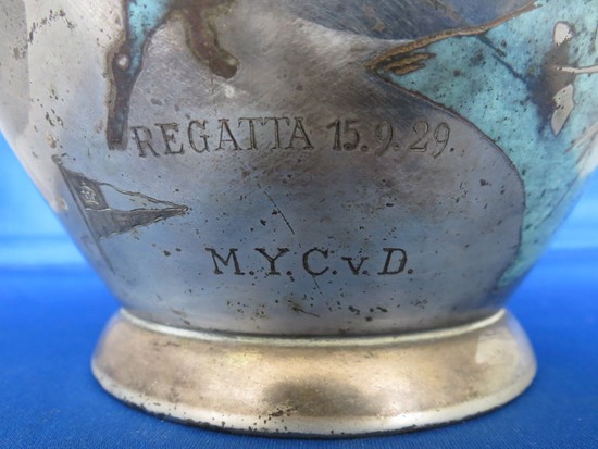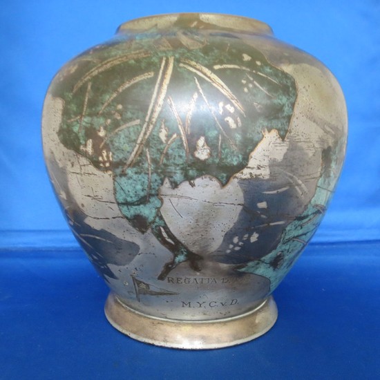 This German art deco dinanderie vase was made by the Ikora workshop of WMF (Wurttembergishe Metalwarenfabric) ca. 1929. The vase is bulbous in shape and has a decorative leaf pattern on all sides. The vase is brass. The background of the vase pattern is silver plate and the leaves are copper with verdigris accents. The vase was presented as a trophy for the Berlin 1929 Motor Yacht Club von Deutchland regatta. It is engraved near the bottom with the Motor Yacht Club of Germany flag/burgee, “M.Y.C. v D.’ (Motor Yacht Club von Deutschland) and “REGATTA 15.9.29”. The Motor Yacht Club of Germany was formed April 27, 1907. The club is located on the eastern shore of the Great Wannsee in Berlin, Germany. The vase has the WMF mark on the base. The stylized tower is derived from the emblem of Geislingen, a local landmark defensive tower. This mark was used from 1025-1950. WMF, Wurttembergische Metalwarenfabrik, was founded in 1880 after the merger of Straub & Sohn and Ritter & Co. of Esslingen, Germany. The vase is 5” tall by 7” wide at it’s widest point. The mouth is 3” in diameter. The base diameter is 4 ½”.